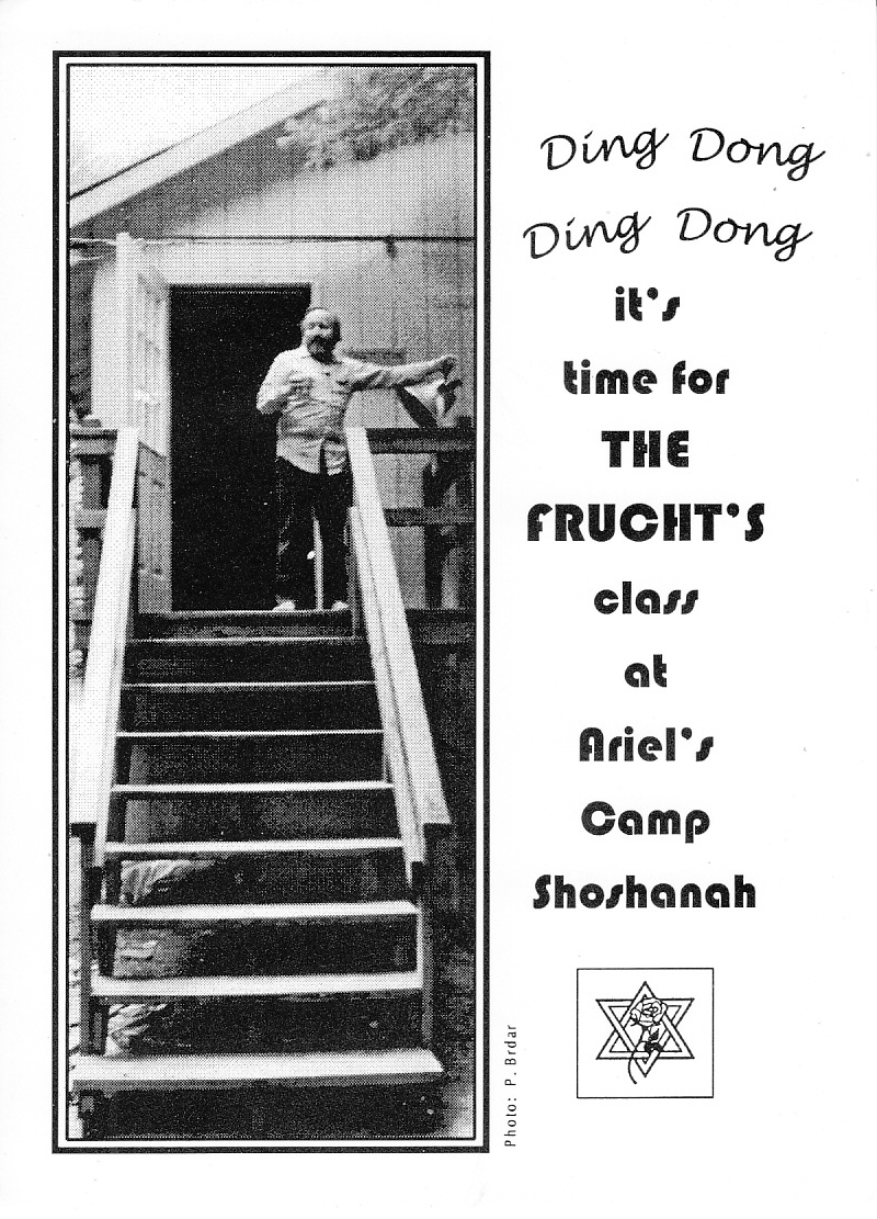 the lake. The middle card a photo of Arnold Fruchtenbaum ringing the bell EXACTLY 5 minutes before the class was to start, printed with what was considered a 'hip' font. The bottom postcard a view of Trout Pond. Yes, pro color postcards had long been available, but these rare cards were produced fully in-house, a labor of love, and sold in only one location on Earth: the Camp Shoshanah Shmata Shop, located in this building. |
