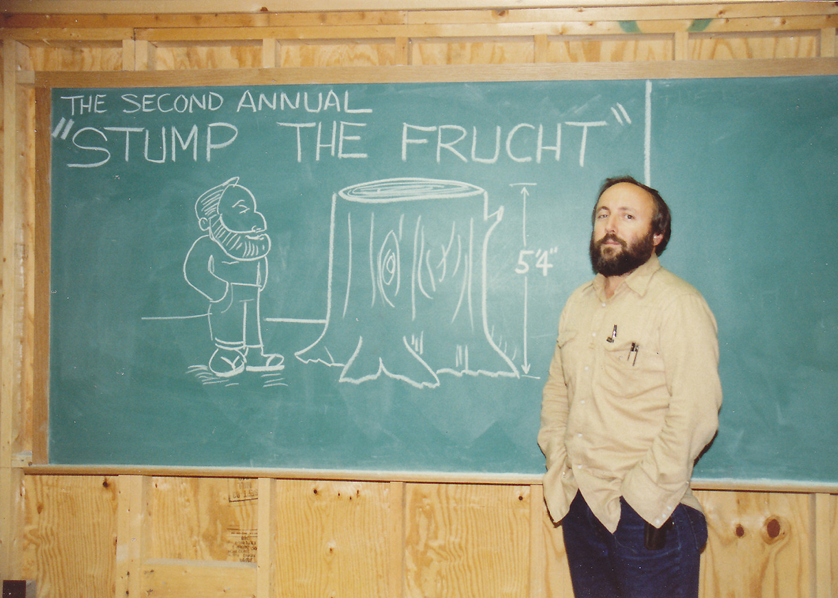 impertinent young fellow from Brooklyn came up with the title: "STUMP THE FRUCHT" and it stuck for many years. The artwork above and AGF sitting on a stump while answering questions were entirely the work of students with too much time on their hands. |