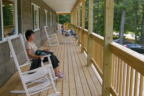 ![]() Outside the dining hall, a porch and rocking chairs becken. |